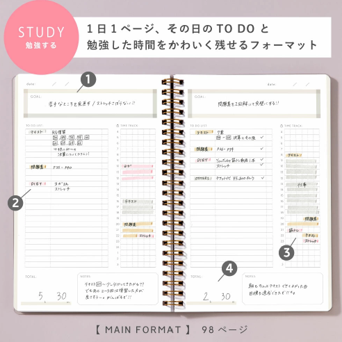 最近は「スタディプランナー」という手帳が人気です。月間や週間、デイリーなど中長期的なスケジュール管理ができます。カラーペンなどを使って何をどれだけ勉強したのか視覚的にわかりやすく、達成感を味わえるのが人気です。
