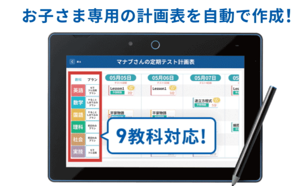 目標点数やテスト範囲を入力すると、自分専用の計画表を自動で作成してくれるから、無理のないプランが立てられます。テストの目標点から逆算して計画表が出来上がります。いつどんなことをやればいいのか、毎日悩む必要がなく、自動作成された計画表を基に効率よく取り組めるから、部活との両立もバッチリです。