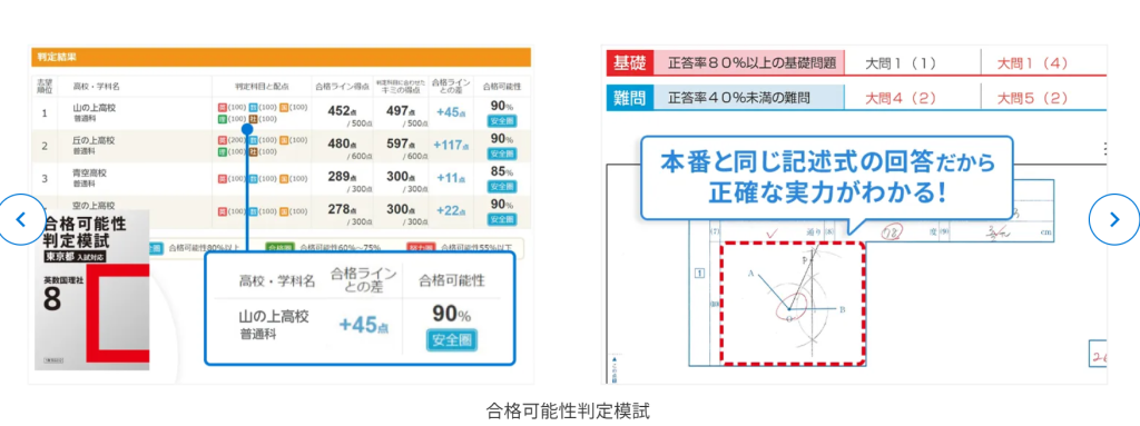 本番と同じ記述式の模試で順位や入試の傾向に合わせたアドバイスをしてくれます。合格点まで力を伸ばすメソッドで入試まで徹底的にフォローしてくれます。