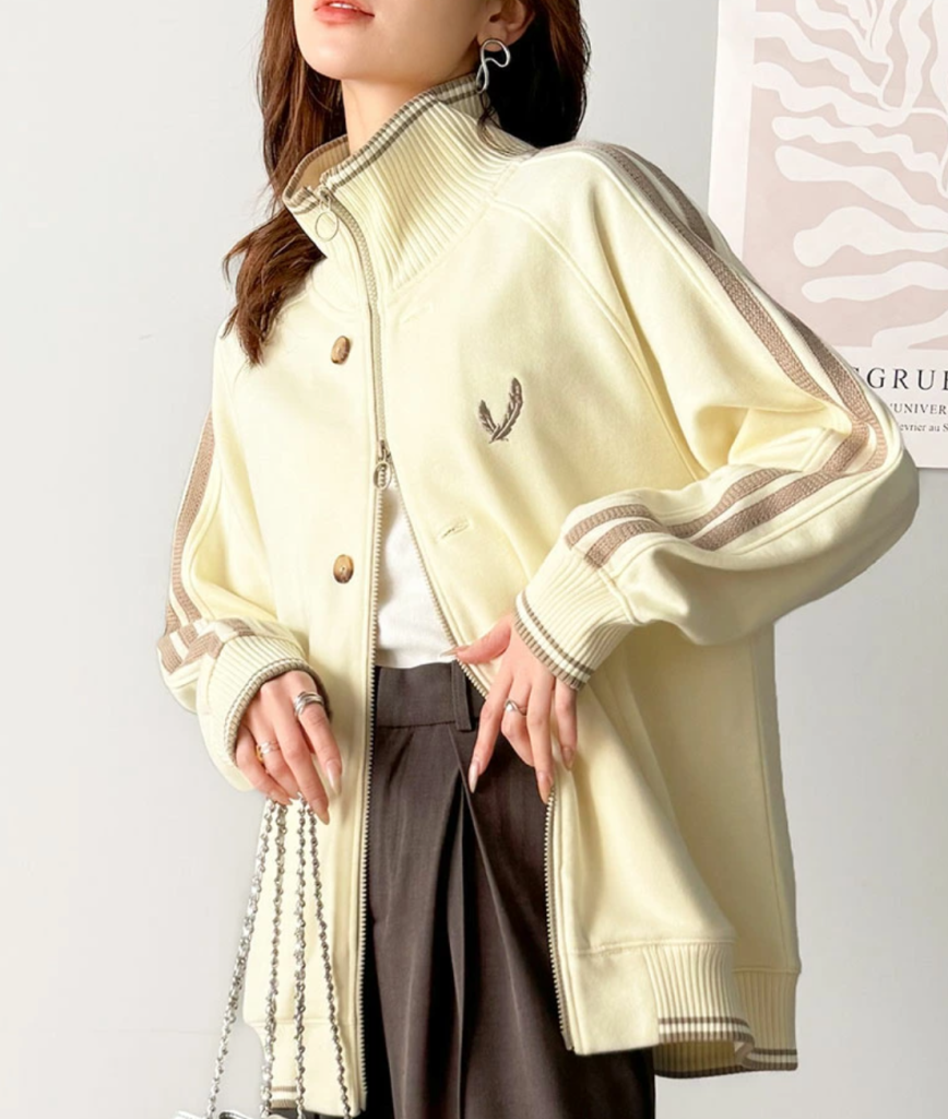 スポーティーな印象のスタンドネックと袖のラインでカジュアルにもきれい目にも合わせやすいブルゾン。フロントボタンで閉めても、ジップアップで閉めてもOKな2WAYタイプだから様々な着こなしができます。程よい厚みで肌寒い季節にも重宝する一枚です。