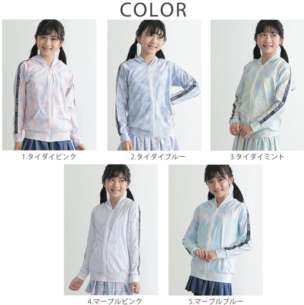 フード付きでしっかり紫外線をカットするジュニアサイズのラッシュガード。爽やかなカラーのバリエーションが豊富で、肩のロゴラインが引き締め効果ありでおしゃれ。水着の上や普段着の羽織としてもしっかりUVカットができて安心ですね。