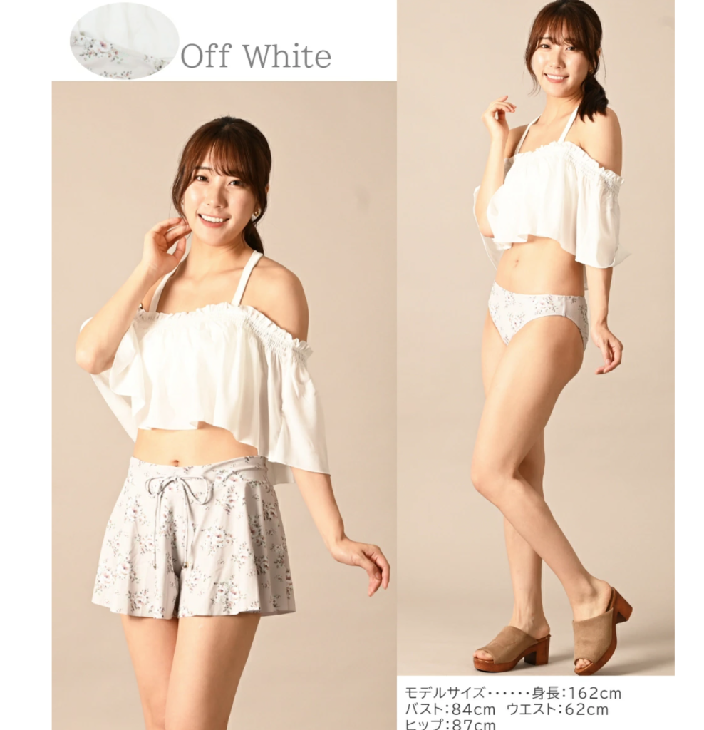 オフショルダータイプのビキニセット。フレアが程よいボリューム感で華奢見せしてくれます。レトロなフラワー柄が可愛らしく、さわやかな印象の水着です。