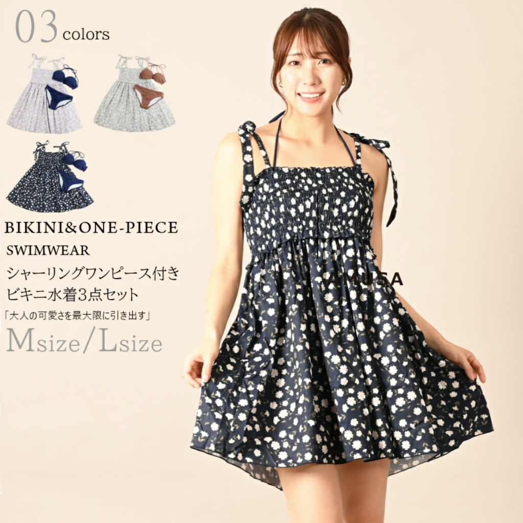 そのまま水に入ってもOKなワンピースが付いたビキニのセット。シティも歩けるワンピースは軽やかで体型カバーもしてくれるシャーリングで上品。スタイルアップしてくれるベーシックなビキニとの組み合わせで夏を思いっきり楽しみましょう!