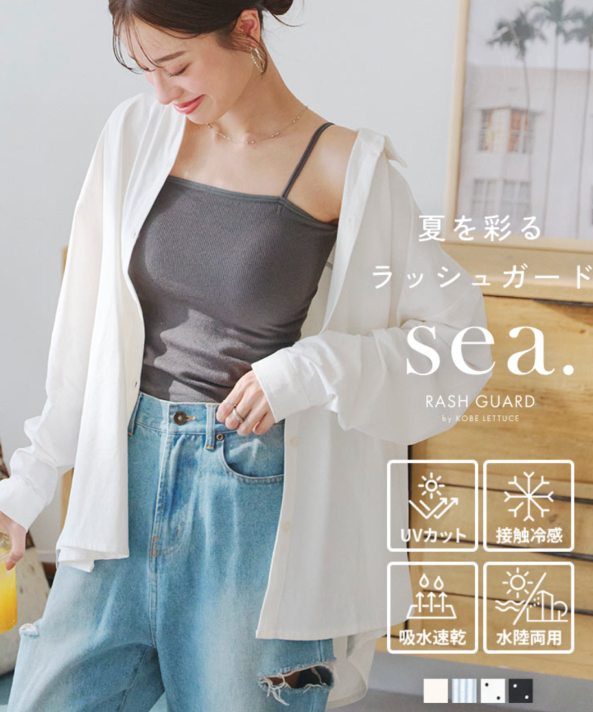 チャックのラッシュガードはたくさんありますが、こちらはまるでシャツのように着られるラッシュガード。そのまま水に入ってもOKなUVカットシャツは、水着にも合わせやすく洋服の上に羽織ってもOK。いかにもラッシュガードという雰囲気ではなくさりげなく紫外線カットしてくれるのがうれしいですね。