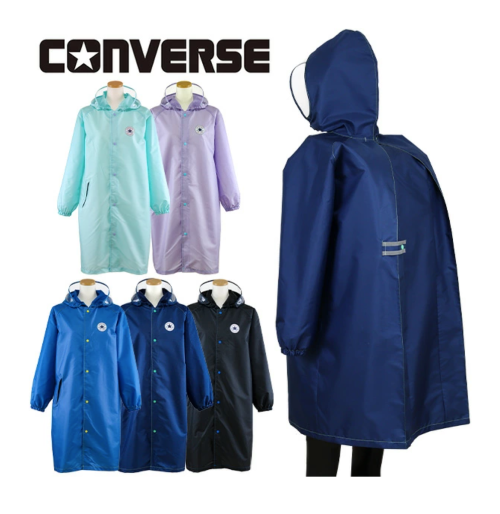 シンプルで長く使えるコンバースのレインコート。強い風でも脱げにくいフードやランドセルの上から羽織れるマチ付きなど使いやすい機能が充実。さらに、レインコートを着たままでも下に着ている服のポケットが使える貫通ポケットでポケットの中の物の出し入れもスムーズです。