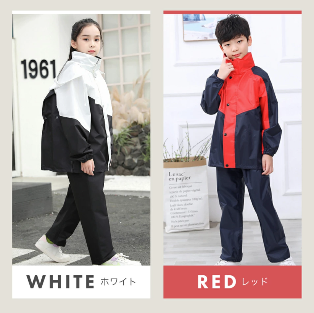 上下セパレートタイプのレインスーツ。ジャンパーのようなデザインでおしゃれだから長く使えます。男女どちらでも使えるデザインなので兄弟姉妹でシェアできるのもうれしいですね。ランドセル対応でリフレクター付き、強い雨風の時は上下で着るとしっかりと雨を防いで安心ですね。