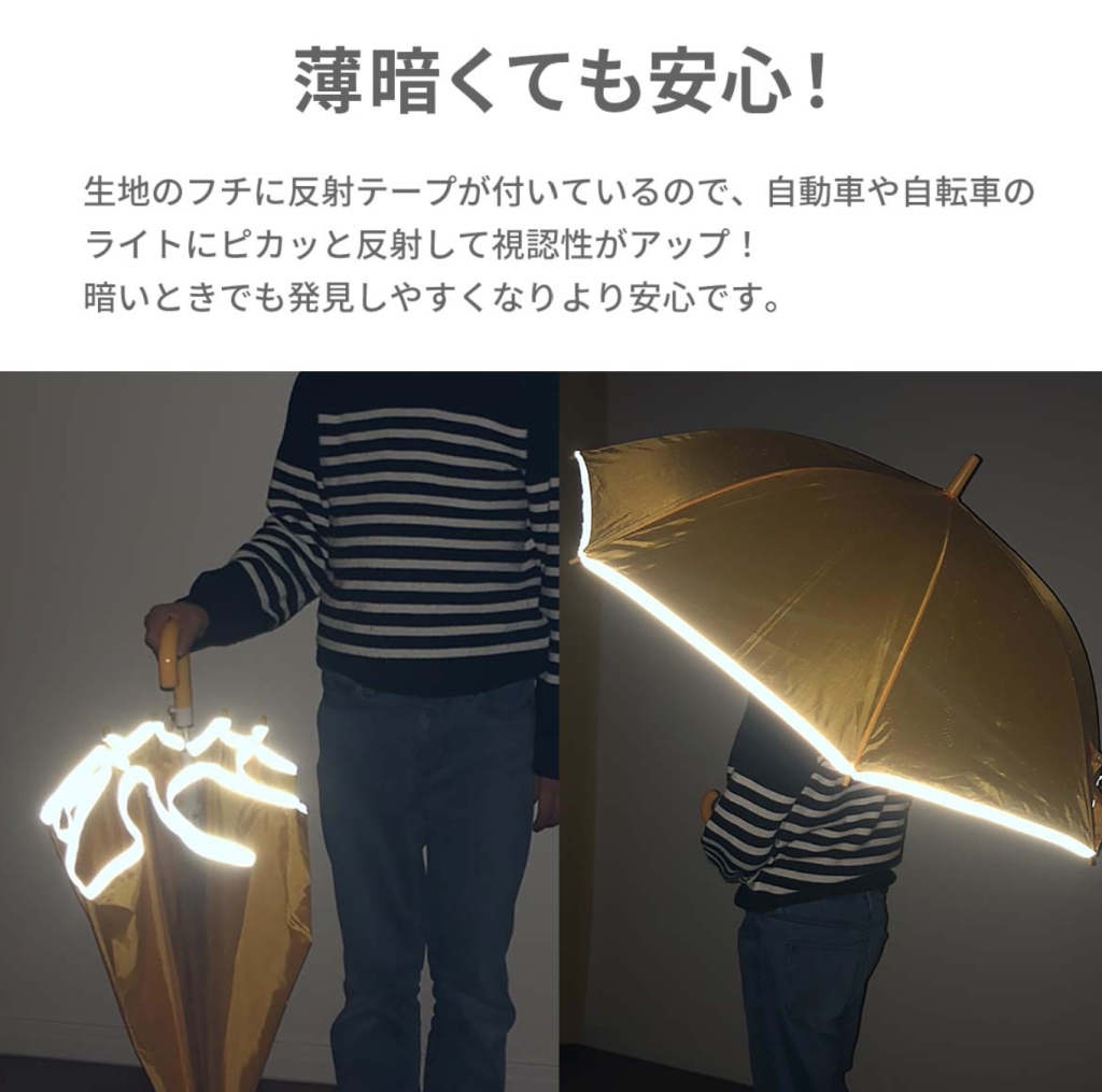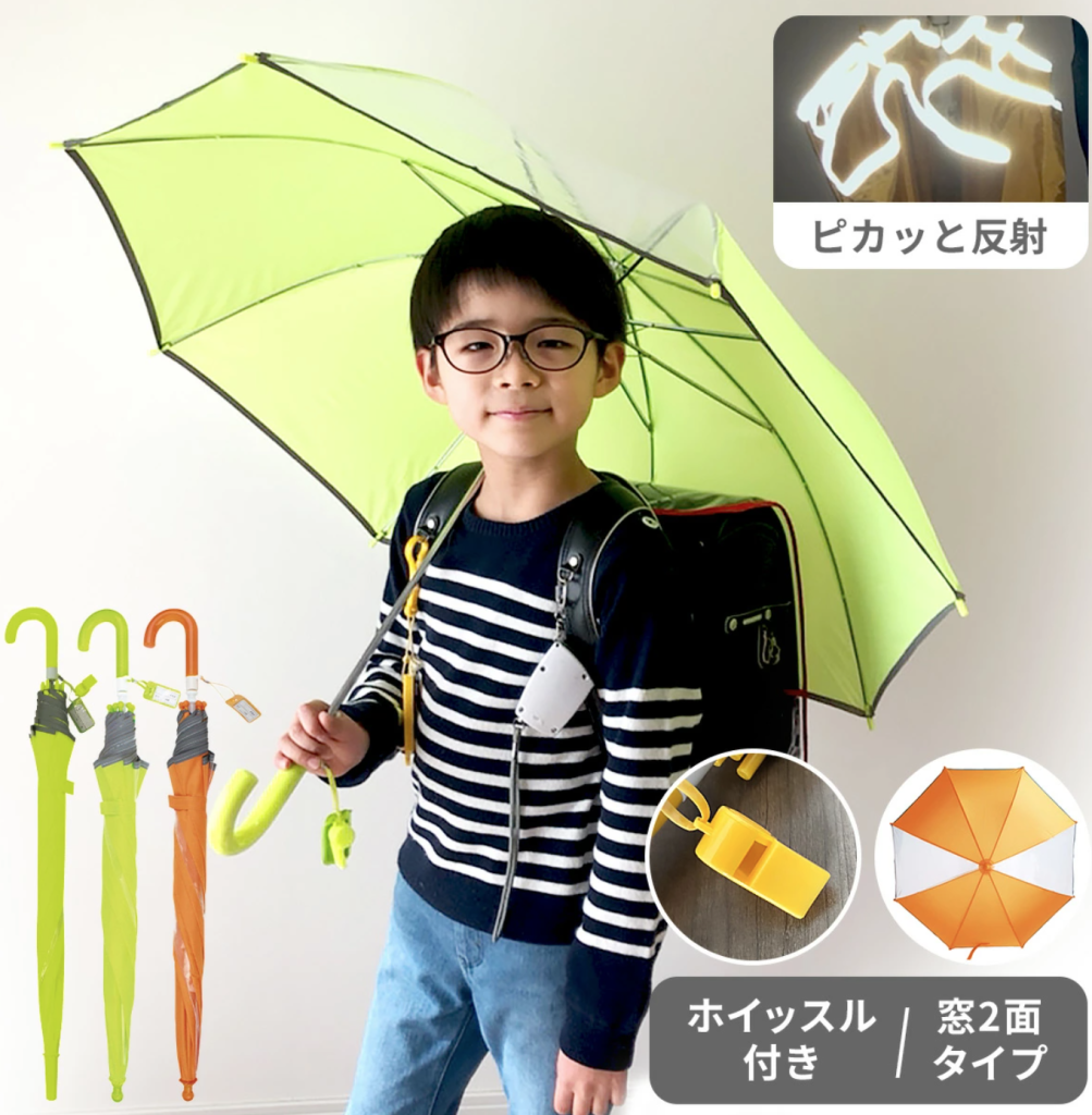 傘の周りを縁取るようにリフレクターが付いているので車のライトなどを反射して見えやすいジャンプ傘。いざという時に役立つホイッスルが付くなど安全面に配慮した傘です。透明窓や名札、ワンタッチで開くなど小学生男子が安全に登下校できる工夫がいっぱいです。