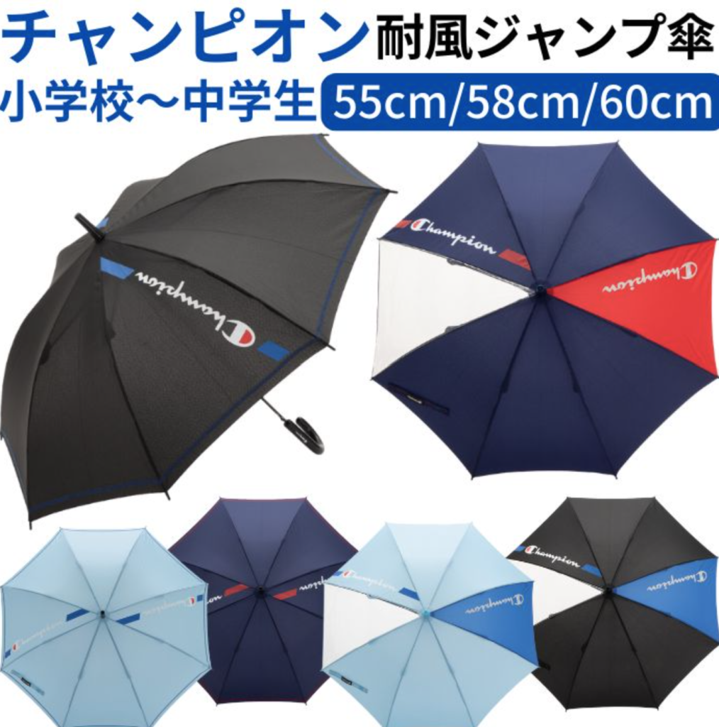 人気のスポーツブランドチャンピオンのデザインがかっこいい小学生男子におすすめの傘。耐風構造で風に強く折れにくく、骨にはグラスファイバーを使用しているので丈夫でさびにくい傘です。プレゼントにも喜ばれるかっこいいデザインで人気です。