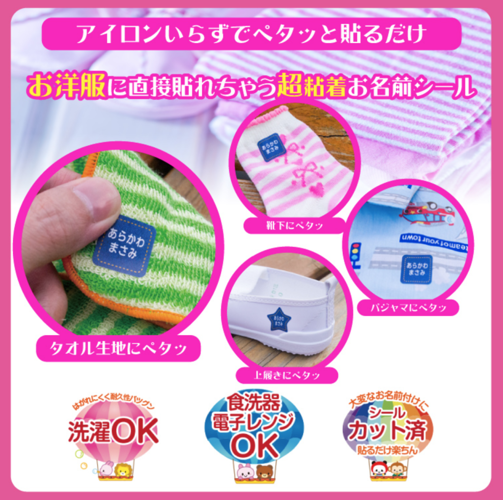 靴下やタオルなど洋服タグ用シールでは貼れない布製品にノンアイロンでそのまま貼れちゃう名前シール。超粘着ではがれにくく、簡単に貼れるので名前つけも簡単です。ピンセット付きで細かな部分に貼るのにも便利ですよ。