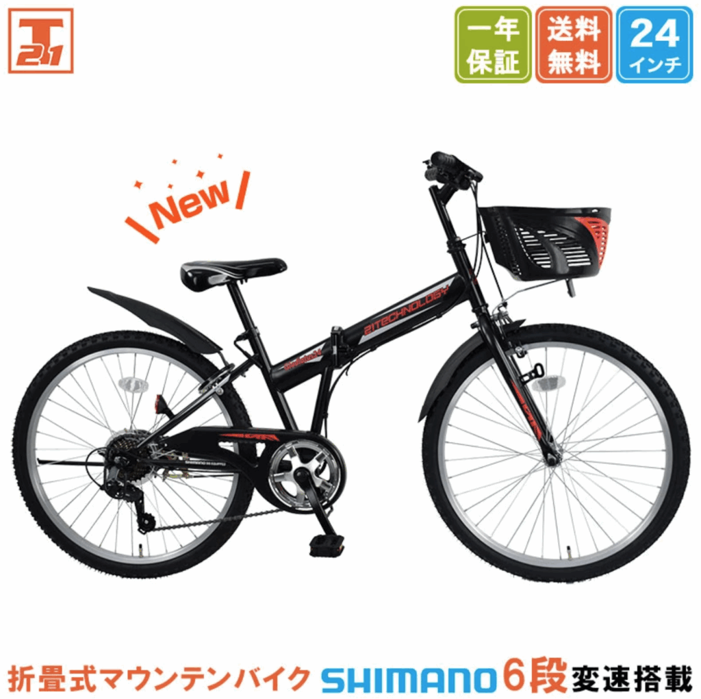 シンプルでかっこいい子ども用自転車。シマノ製の変速器付きでマウンテンバイクタイヤを装備しています。スッキリとしたスタイルで、小学生男子のお出かけをサポートします。折り畳み式だからコンパクトになって車に積んでお出かけに持っていくこともできますね。