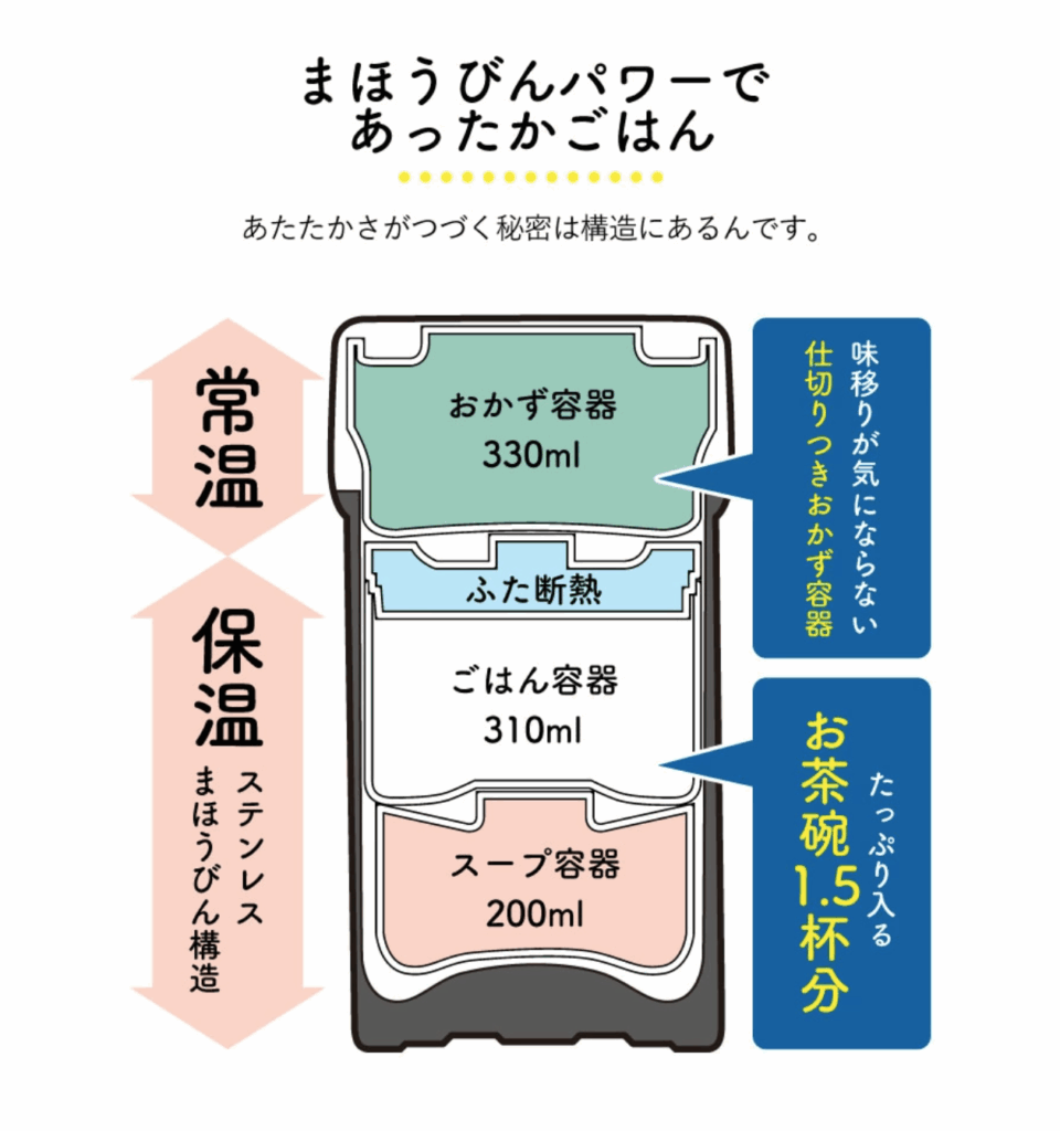 ごはん容器が保温になっているので、温かいまま持ち運べるお弁当箱。食洗器対応でおかず容器はふたをはずせは電子レンジもOK!保温バッグや箸が付いているのでランチタイムはそのまま持ち運べます。しっかりと保温できるので温かいご飯が食べられるのは嬉しいですね!