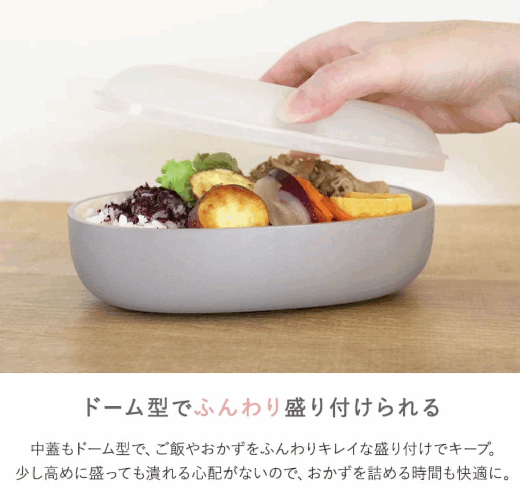 丸っこい形が可愛すぎるお弁当箱。コロンとした形でくすみカラーが今っぽくてかわいいですね。見た目だけじゃなく機能性もしっかりと備えています。食洗器対応・電子レンジOKで使い勝手も良く、内フタがドーム型なので押さえつけずにふんわりときれいな盛り付けのままキープできます。
