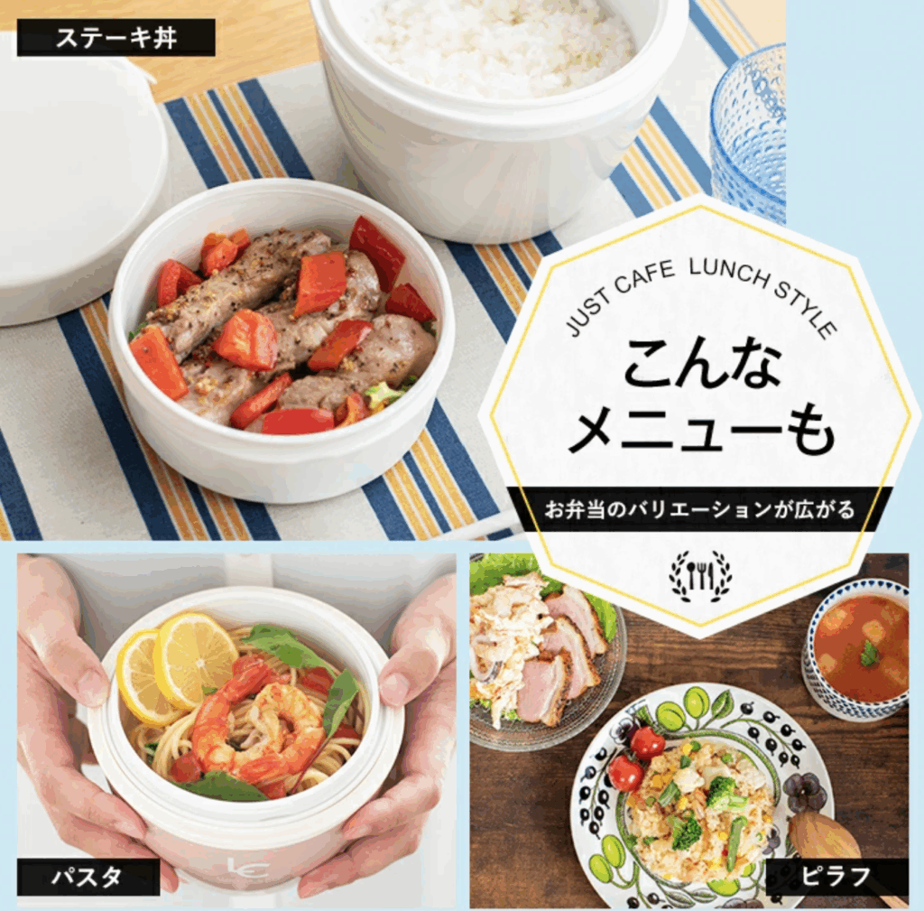 熱々のままお弁当を持ち運べるカフェ丼ランチ。おかずを冷まさずに熱々のまま入れておけばお昼まで温かく、ご飯も柔らか。冷ます時間が必要ないので時短にもなります。どんぶりやスープなどメニューの幅も広がりますね。保冷もできるので夏場に冷たい麺などもおすすめです。