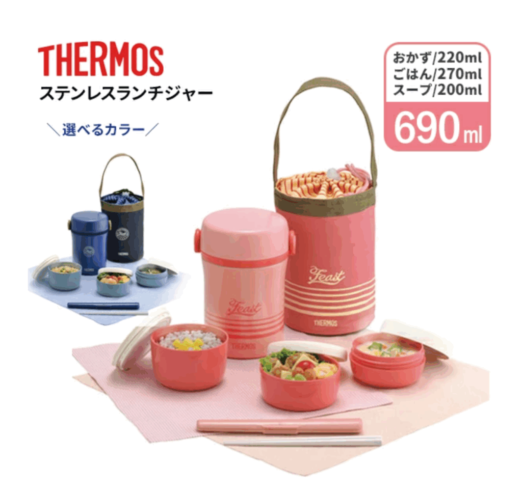 サーモスのステンレスランチジャーは、ご飯とスープ容器が保温になっているので、ご飯とスープは熱々を持ち運べます。傷みやすいおかずは常温で運べるのでフルーツなども入れられますね。シチューやカレー、熱々の炒め物などお昼ご飯に温かい食事ができておすすめです。