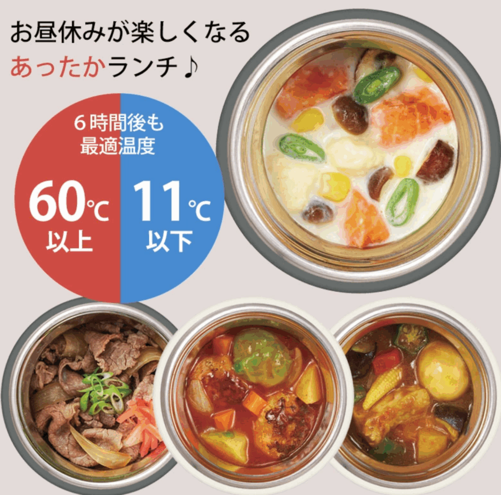 サーモスの真空断熱スープジャーなら、おにぎりやお弁当にプラスするだけで暖かいスープを持ち運べます。シチューや豚汁などランチにプラスすると身体も温まってホッとしますね。食洗器OKでお手入れもしやすくおいしいランチが簡単に楽しめます。
