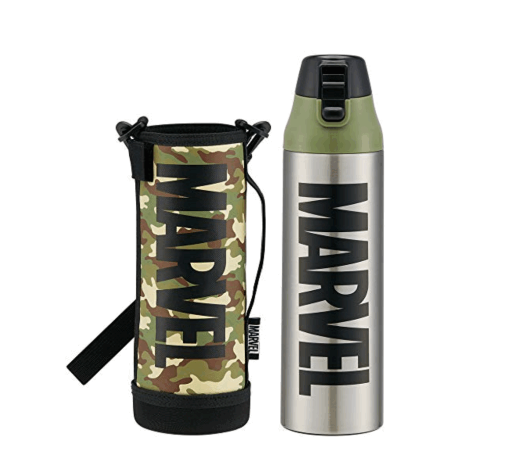 マーベルの大きなロゴと、ミリタリー調のカムフラージュ柄がかっこいいスケーターの直飲み水筒。本体とカバーに大きなロゴがデザインされ、カラーも統一されていてとってもおしゃれ。簡単な操作で飲める直飲みタイプだから気軽にごくごく水分補給できます。