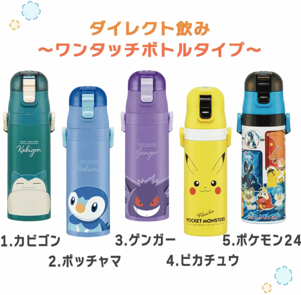 コップタイプと直飲みタイプの2WAYタイプデザインもあるスケーターのステンレスボトル。ポケモンの人気のデザインで好きなポケモンを持ち歩こう!かわいいデザインだけじゃなく、保温・保冷機能もしっかり。広口ボトルなので大きな氷も入れやすくお手入れもしやすいのが◎。