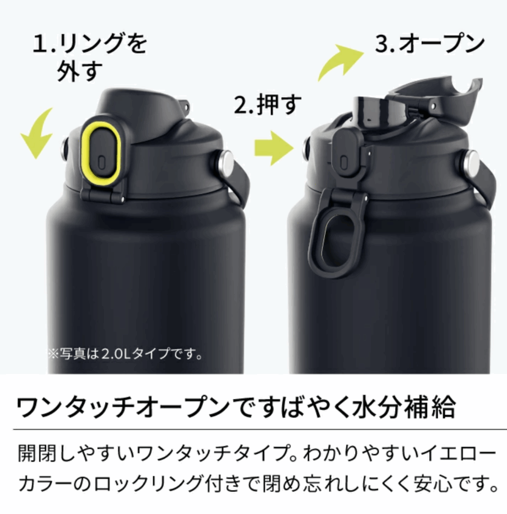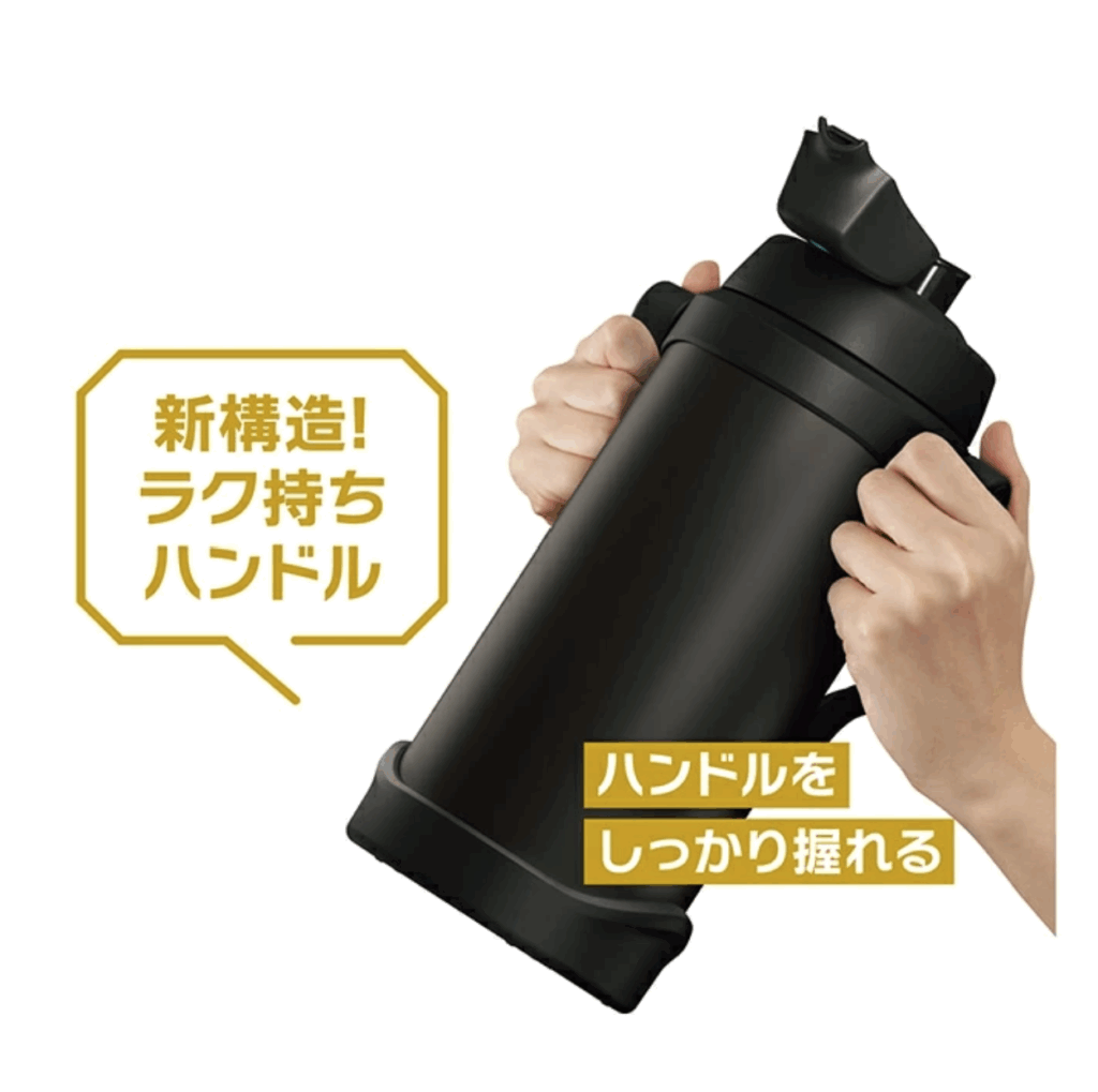 サーモスのスポーツジャグは、2Lの大容量でたっぷり入った状態でも両手で持ちやすいハンドルが付いているので安定して飲めるのが◎。持ち運びしやすく飲みやすいハンドルの形状と広口でお手入れしやすく大きな氷も簡単に入れられます。