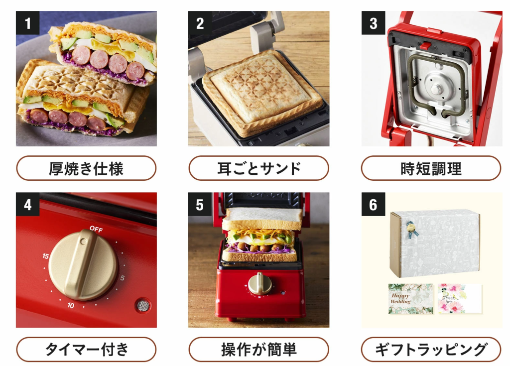 かわいいデザインはもちろん、6枚切りのパンを耳ごとサンドできるなど、手軽にホットサンドが楽しめるBRUNOのグリルサンドメーカー。シンプルな操作でいろんな具材を挟んだホットサンドが出来上がります。厚焼き仕様だから、しっかりとボリュームたっぷりの具材を挟めます。