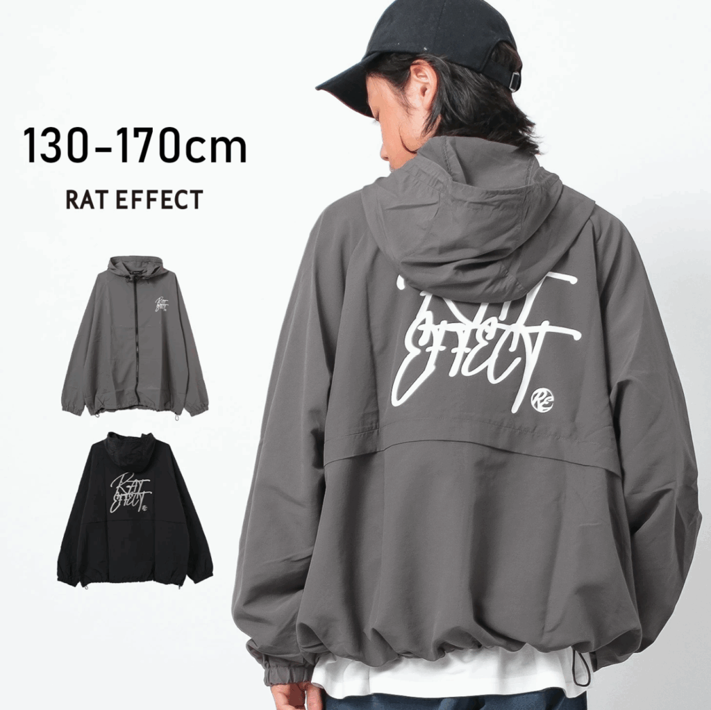 ジュニアサイズのファッションを展開するラットエフェクト。トレンド感のあるハーフジップデザインに加え、ストリート調のバックロゴがインパクトをプラスしたナイロン生地のプルオーバー。軽くて持ち運びにも便利なので長い季節重宝する一枚です。