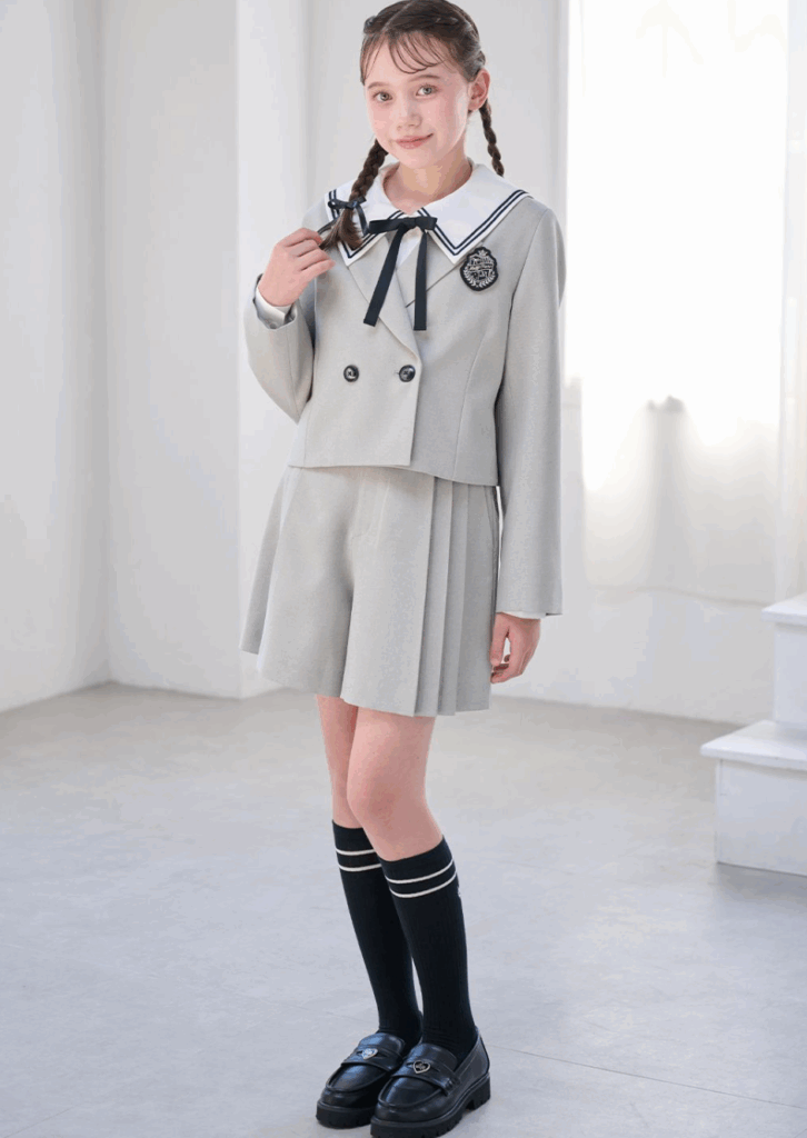 クロップド丈のボレロジャケットとプリーツ入りキュロットのセットアイテムです。大人っぽい明るいグレーがセレモニーを華やかに彩ります。ジャケットのインナーにはセーラーブラウスがおすすめ。衿をジャケットから出して新鮮なスタイリングがかわいい。