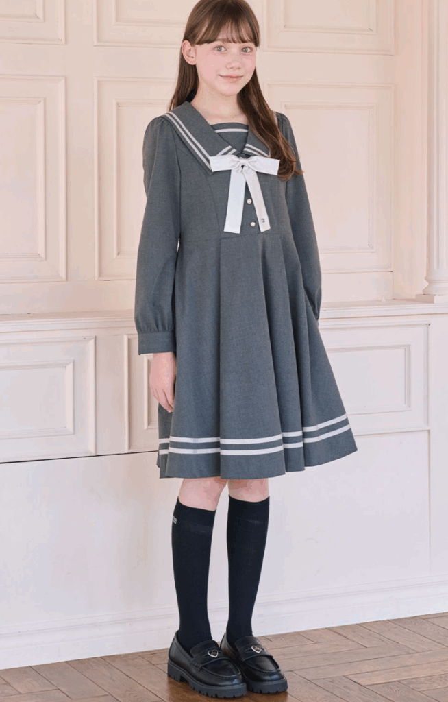 大きな衿とライン使いが目を引くセーラーカラーのワンピースです。光沢感のあるリボンタイやパールボタンで上品なアクセントをプラス。動くたびに広がるきれいなフレアスカートのシルエットにもこだわっています。