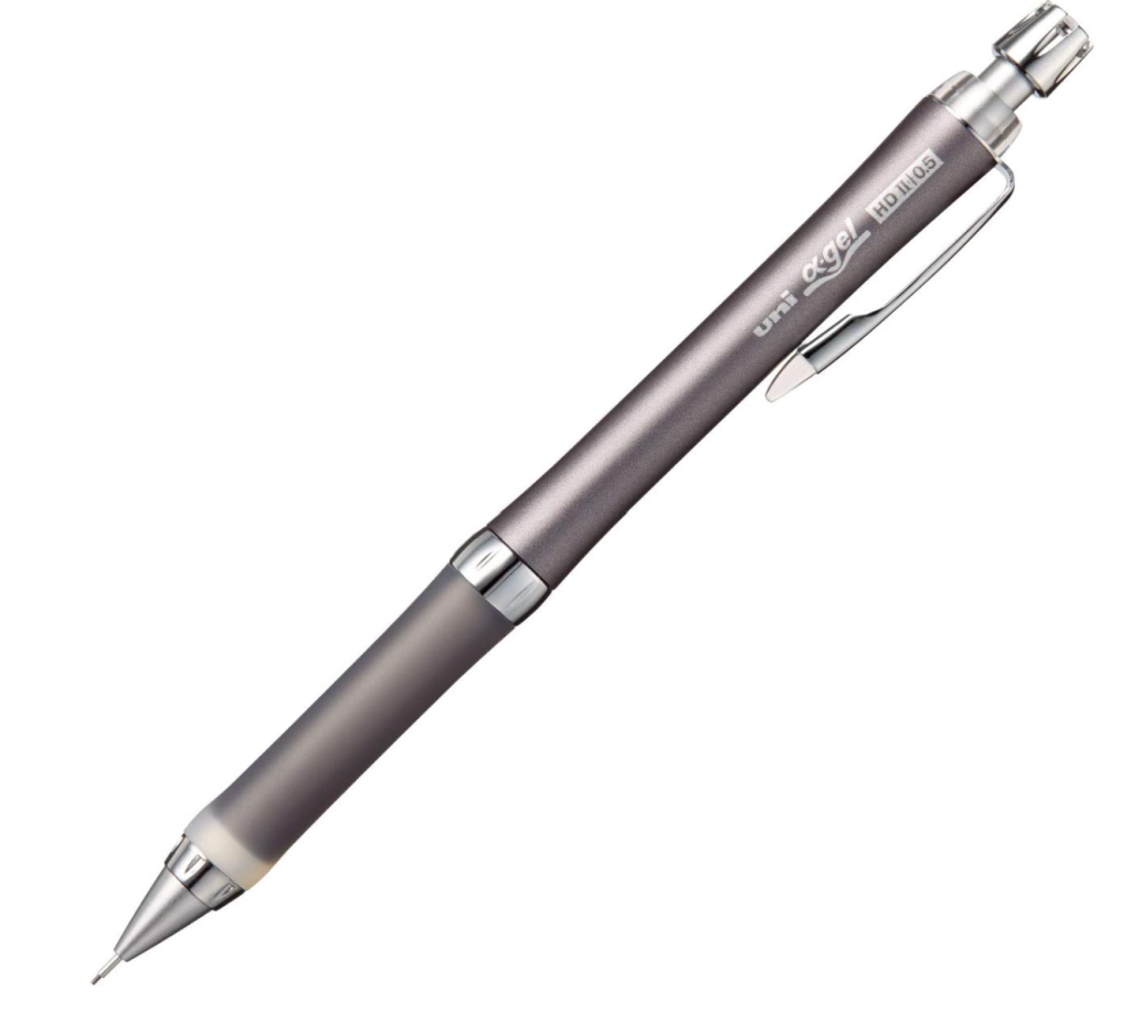 ペン先とグリップが一体化したタイプでペン先が緩まずに安定した書き心地が続くシャーペンです。ラバー付きの金属グリップが指に沿うようにフィットし、握りやすく書きやすいので人気です。ペン先のパイプが細く、書いている文字が見やすいので勉強がはかどります。