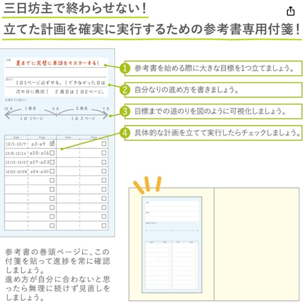 参考書や問題集の最初のページにこの付箋を貼って、計画的に進めるための専用付箋です。東大クイズ王・伊沢拓司が率いる知識集団「QuizKnock」と共同開発した、学習計画を立てやすくするための付箋。見やすく工夫された計画表で、付箋で簡単に貼ってはがせるので管理しやすくおすすめですよ。