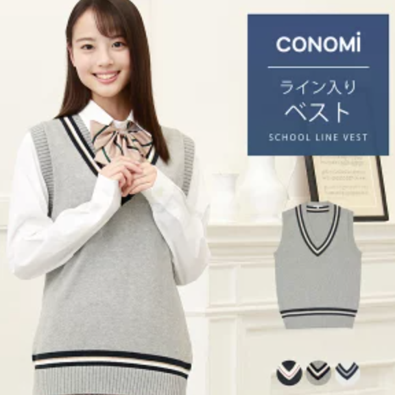 かわいいデザインのニットが人気のconomiのスクールセーター。襟元と裾にアクセントになるラインが入っているコットンベストは、シンプルな制服に合わせるとスタイルアップできるデザインです。程よいゆとりで清潔感がありおしゃれな印象になります。