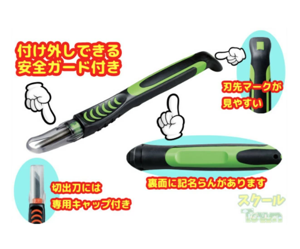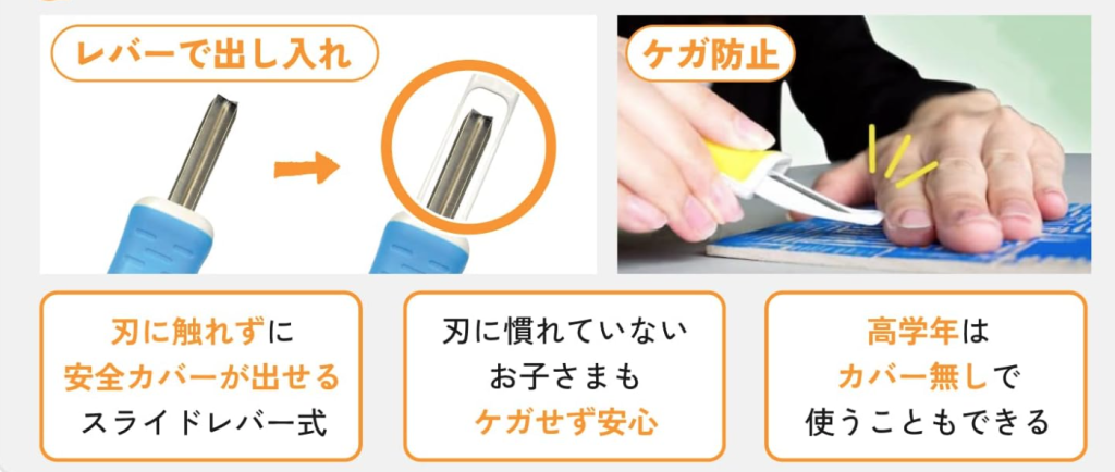 けが防止の安全カバーや、握る部分にグリップの付いたラバーグリップ、収納しやすく取り出しやすいケースなど、小学生にも使いやすい工夫がいっぱいです。