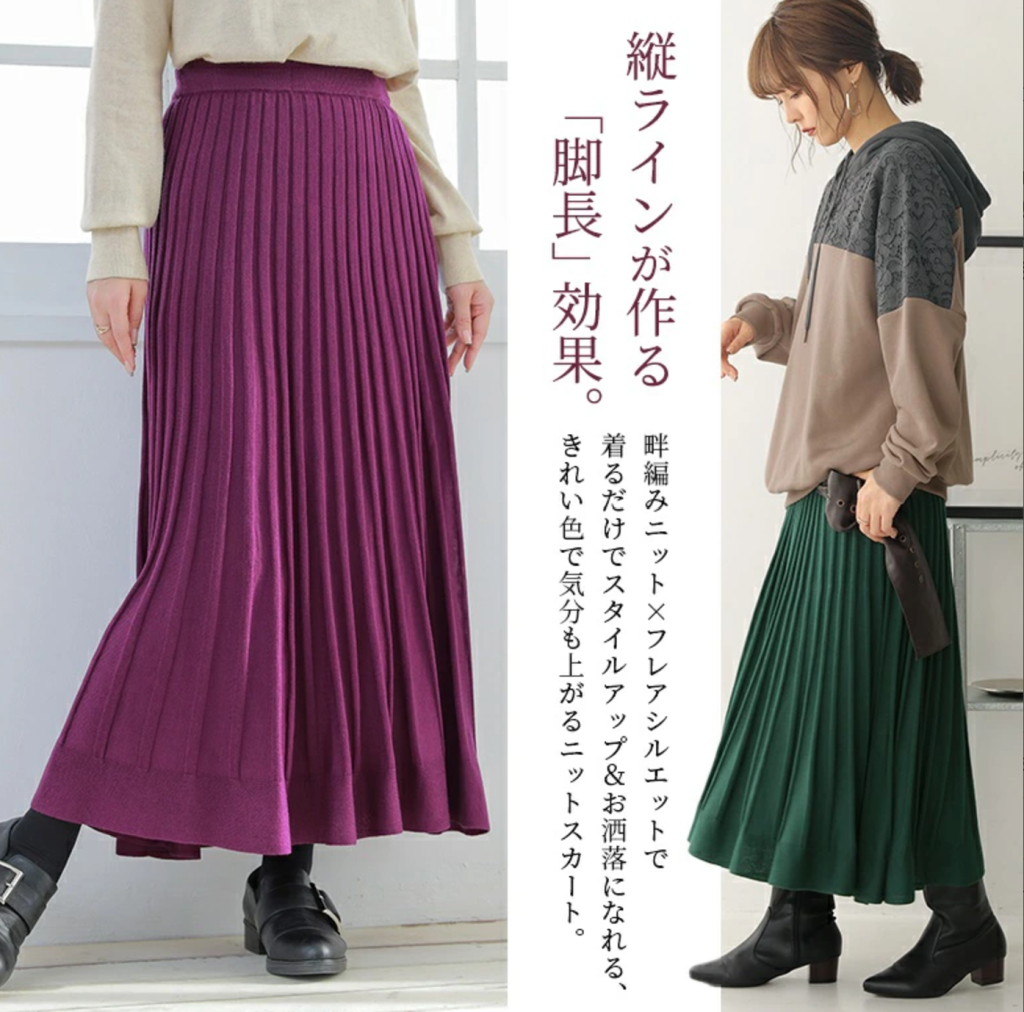裾に向かって自然に広がる美しいフレアシルエットが、縦のラインで脚長効果を生み出し、着やせ効果が期待できるニットスカート。豊富なカラーラインナップで色違いも欲しくなるスカートです。ほんのりマットな光沢感のある糸で見込んだハイゲージニット生地は柔らかで、サラッとした肌触りのカットソーの裏地付きで、安心してご着用いただけます。お好みの丈感やシルエットを選べるM~3Lサイズ展開が嬉しいですね。