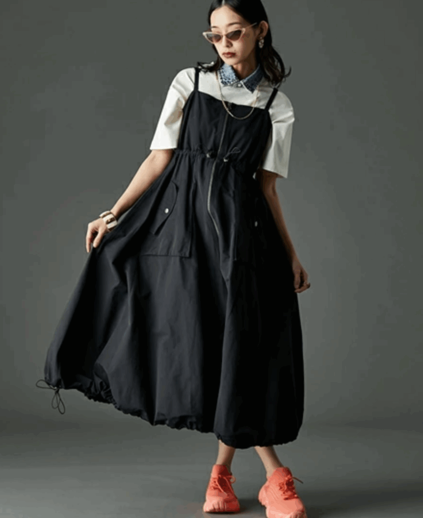 少し張り感のある素材を使って、デザインワークディテールのアウトポケットを付けたデザイン。ウエストからきれいに広がるフレアスカートは裾のゴムスピンドルを絞ってバルーンスカートにも変身します。大きめサイズも展開しているので、自分好みのフィット感を選べますよ。