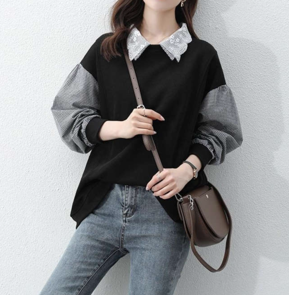 袖の切り替えや、襟元のレースがポイントでかわいいプルオーバー。お尻が隠れる丈感や、ふんわりとした袖など体型カバーしながら、かわいいレース襟が視線を上に上げてくれて着やせ効果も期待できます。かわいいデザインでMIXコーデにもおすすめですよ。