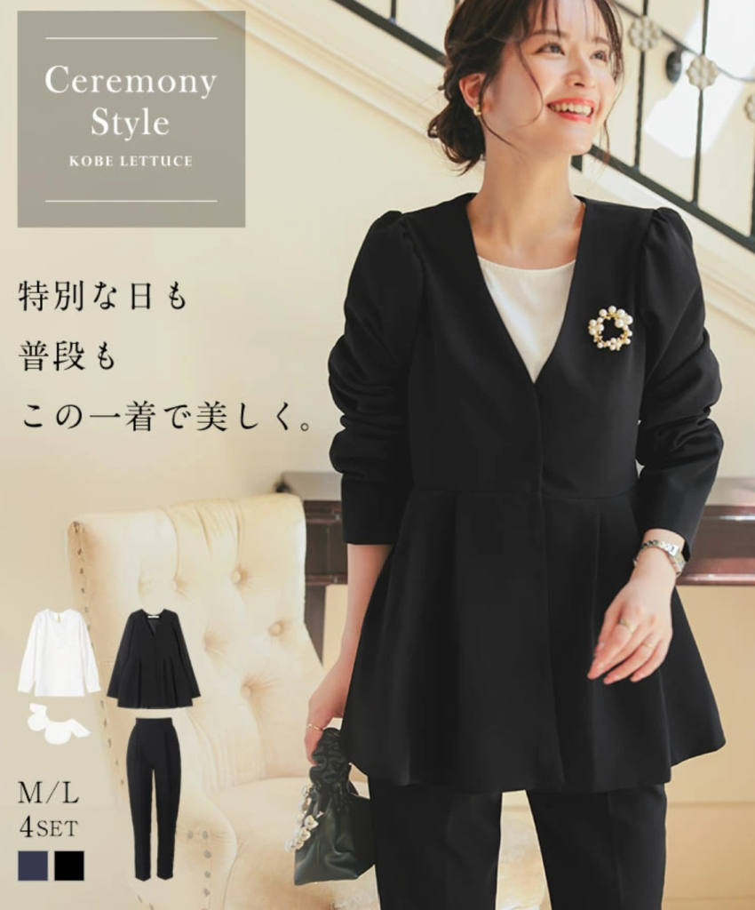 ペプラムジャケット・テーパードパンツ・フレアブラウス・つけ襟の4点セットで様々な表情を見せてくれる人気のスーツ。アレンジしやすく入学式や卒園式など様々なシーンで活躍するコスパの良いスーツセットです。