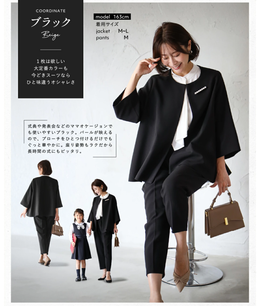 ビジネススーツよりは少し華のある上品なセレモニースーツやワンピースにジャケットを羽織るのが正解コーデ。最近ではパンツスーツなどのスタイルも人気です。キレイめのセットアップでジャケットなしのスタイルでも式典にふさわしい服装になるものも多数ありますが、学校などによってはジャケットを羽織るべき場合もありますので確認が必要です。