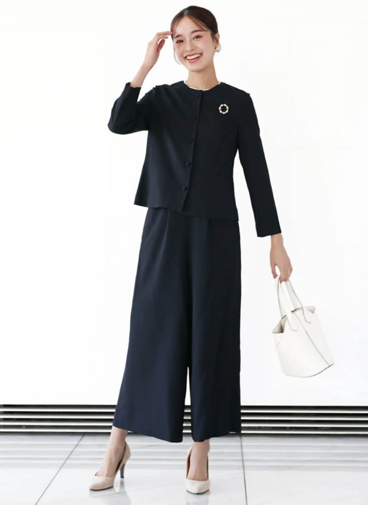 足の線を拾わない美脚シルエットのワイドパンツと着回ししやすいジャケットのセットアップ。パンツはセンタープレスが入っており、きちんとした印象になります。背面はゴム仕様でリラックスして着用することが可能。 ブラウスは程よい光沢がありエレガントな雰囲気で、ハレの日のコーディネートを華やかにしてくれます。
