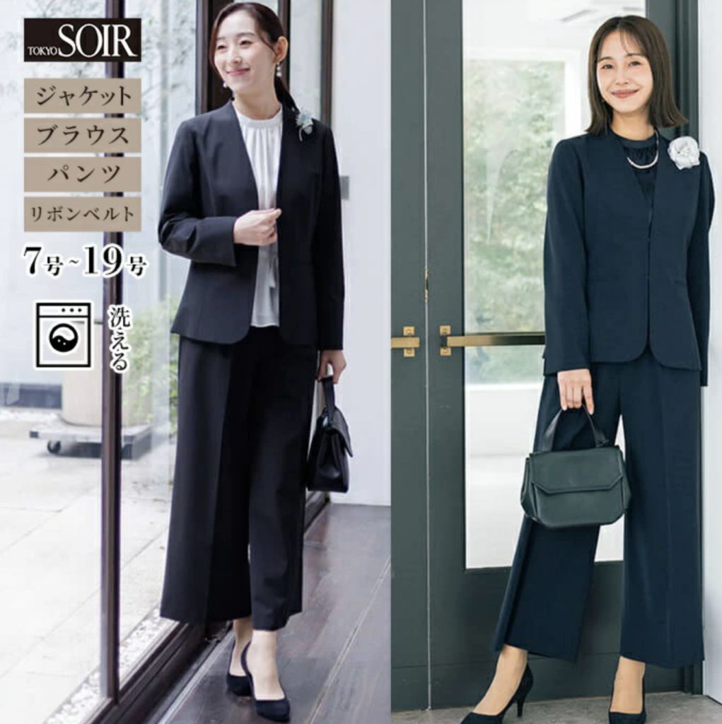 セレモニースーツなどのフォーマルファッションのブランドとして圧倒的な知名度を誇る東京ソワール。上質な素材とフォーマルな場にふさわしいデザインは王道スタイルで様々なシーンで使えます。ジャケットが2着セットなのでシーンに合わせて使い分けられます。