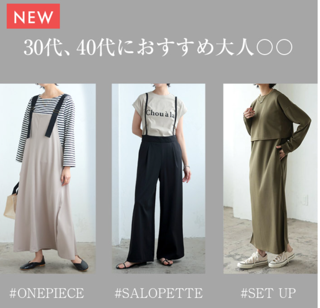 | おすすめポイント | ・大人かわいいきれいめカジュアルが揃う ・大人の女性向けなので無理のないカジュアルアイテムが買える |