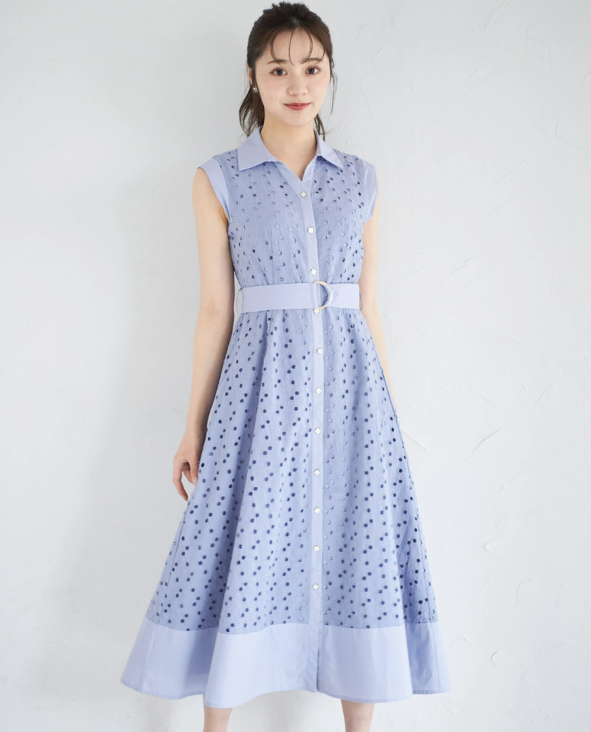 繊細なラインが華奢見せしてくれる爽やかなワンピース。涼しげなコットンレースが女性らしい優しい雰囲気がおしゃれなワンピースです。お花釦がアクセントになっていて、ベルトが自然できれいなラインを作ってくれます。