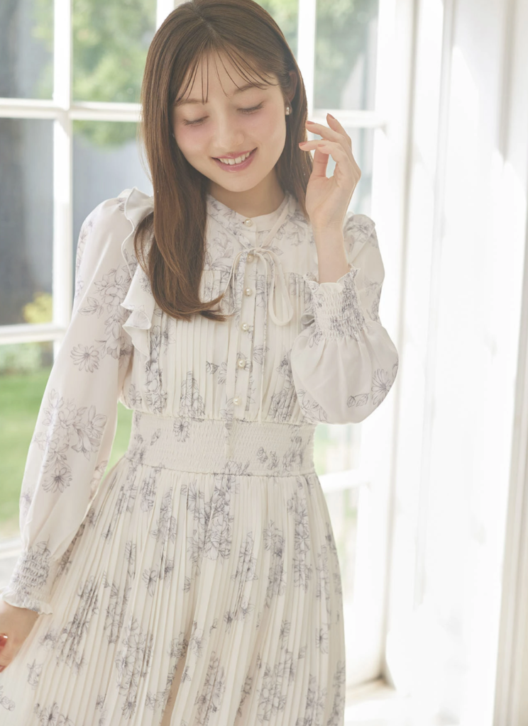 柔らかなヴィンテージサテン生地に繊細なフラワー柄で上品なお嬢様スタイルに。シャーリング仕立てが細見せを叶えます。柔らかな風合いでどこから見ても華やかな一着。フェミニンで可愛らしいワンピースに夢中です。