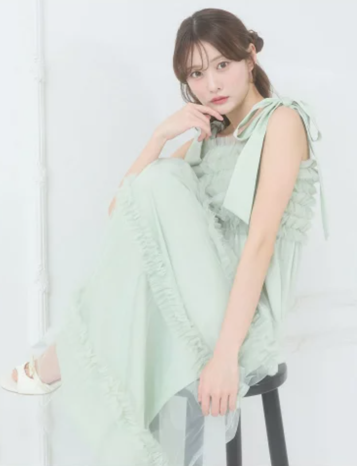 上品で透け感のある華やかなワンピース。大人っぽさの中に可愛らしさがあって女子高校生におすすめです。デコルテがスッキリして華奢見えするスタイルにこだわったかわいい一着。