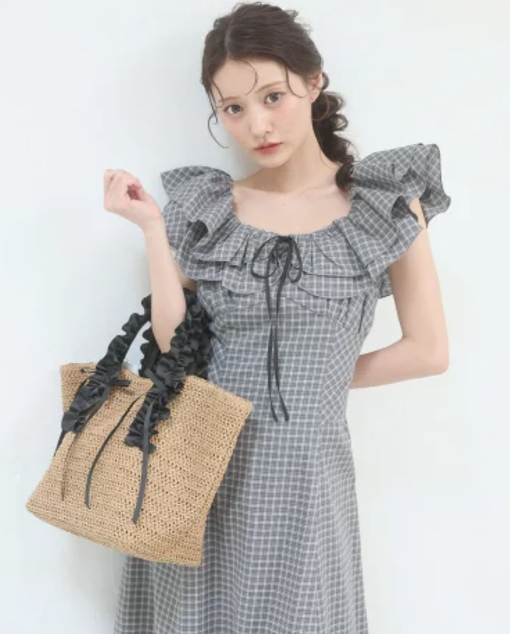 肩のフリルがフェミニンな雰囲気を演出するドッキングワンピース。繊細な生地がふんわりと軽やかな印象です。胸下からラインが広がるので足長効果も。かわいい要素満載のワンピースです。